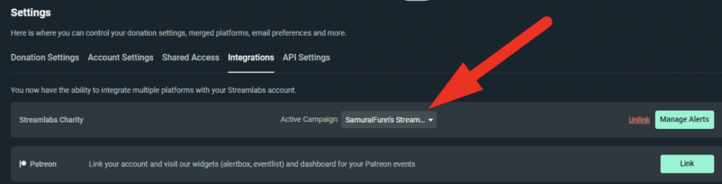 - Once finished, link your streamlabs alerts from your Streamlabs Settings page.