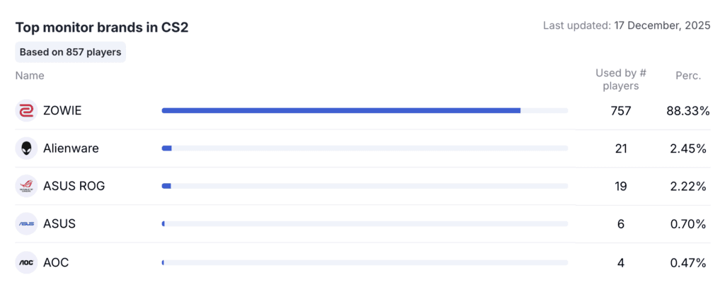 ZOWIE's monitors in comparison to others on the market might look chunky, but remain a go-to favourite for Counter-Strike professionals and tournament organizers. Based on ProSettings, over 88% of professional CS2 players use ZOWIE monitors, with the ZOWIE XL2566K and XL2546K making up 55% of that market share.
